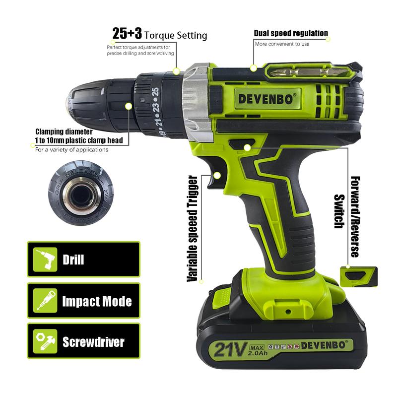 【21V Electric Drill】 This cordless drill features two variable speeds (0-350/0-1350 rpm) and 18+1 torque settings for precision and control.