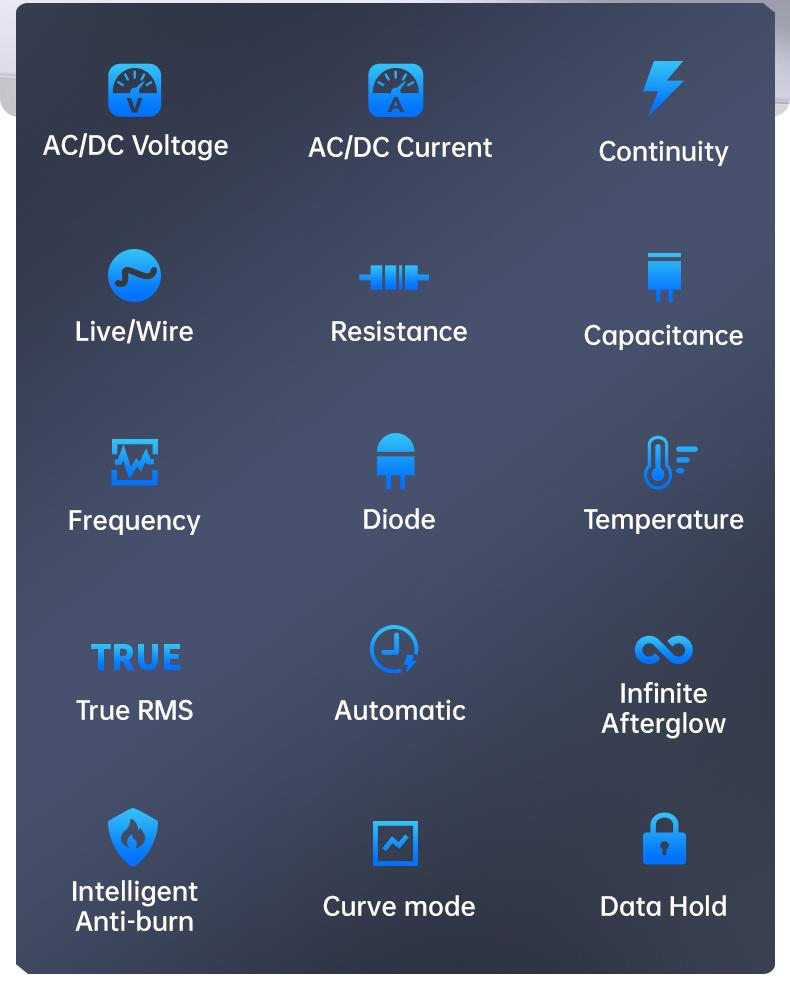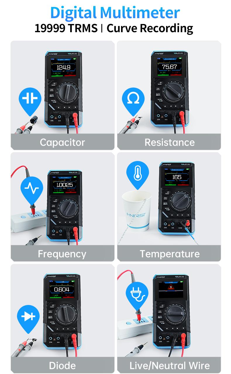 ✦【19999-count Digital Multimeter】Curve recording, max/min value display. Measures AC/DC voltage current, resistance, capacitance, frequency, diode, and temperature. Includes continuity test, live/neutral detection, auto range, and data hold