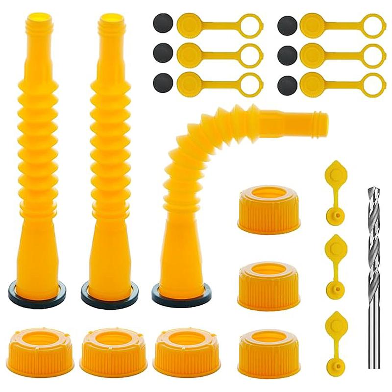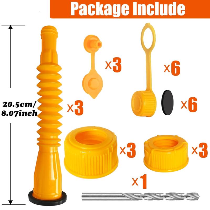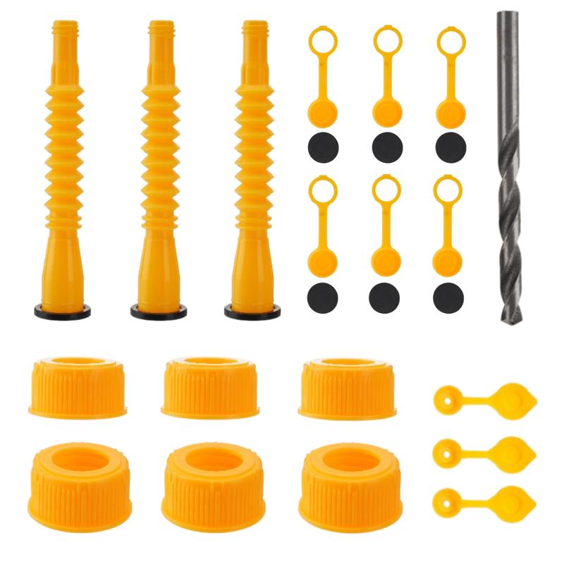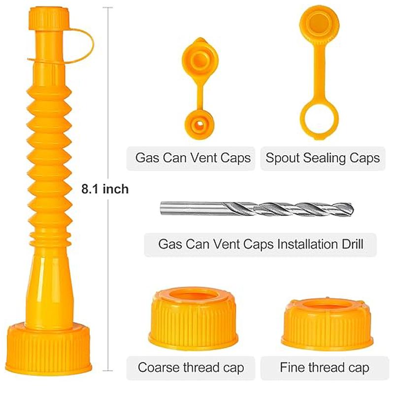 - Simple to install,4 Each set of products includes,6 Screw Collar Caps(3 Coarse Thread & 3 Fine Thread) 3 yellow Spouts and rubber gaskets, 3 nozzle caps with threads, 2 kinds of gas can vent caps, And the drill bit required to install the gas discharge cap.