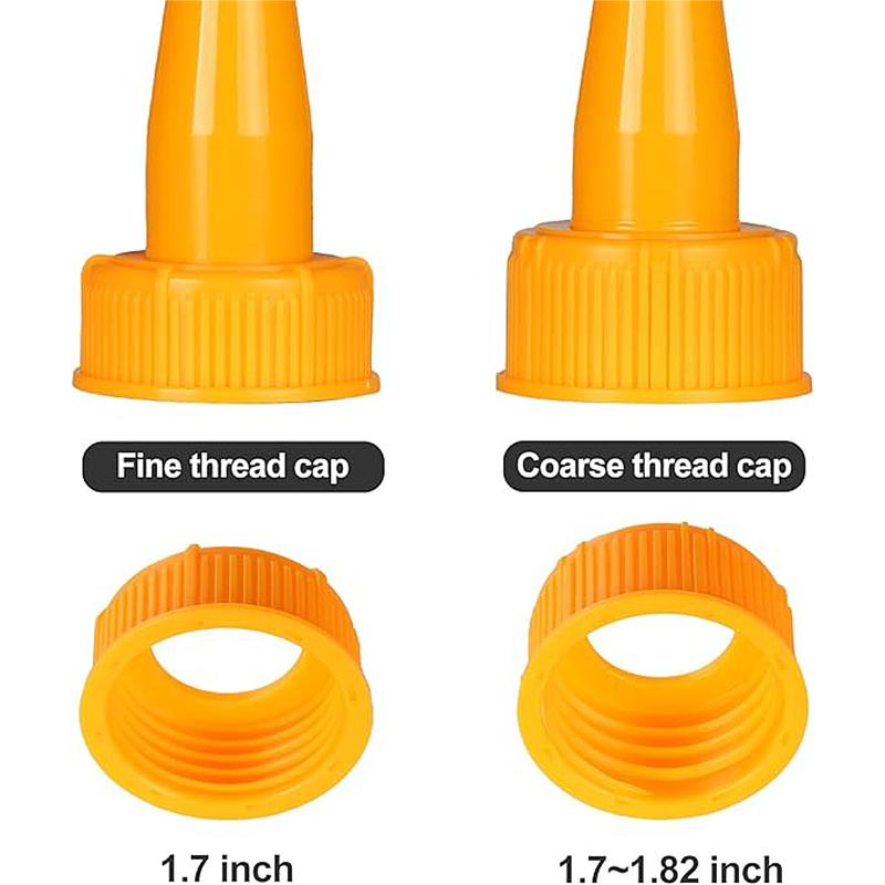 - Gas Can Spout Replacement, Suitable for most 1/2/5/10 gal oil cans, We provide 6 threaded collar caps 3 Coarse Thread &3 Fine Thread. As shown in the picture The internal thread size is 1-3/4--1.7in, It can only be used for gas tanks with a tank mouth size of 1.75in.