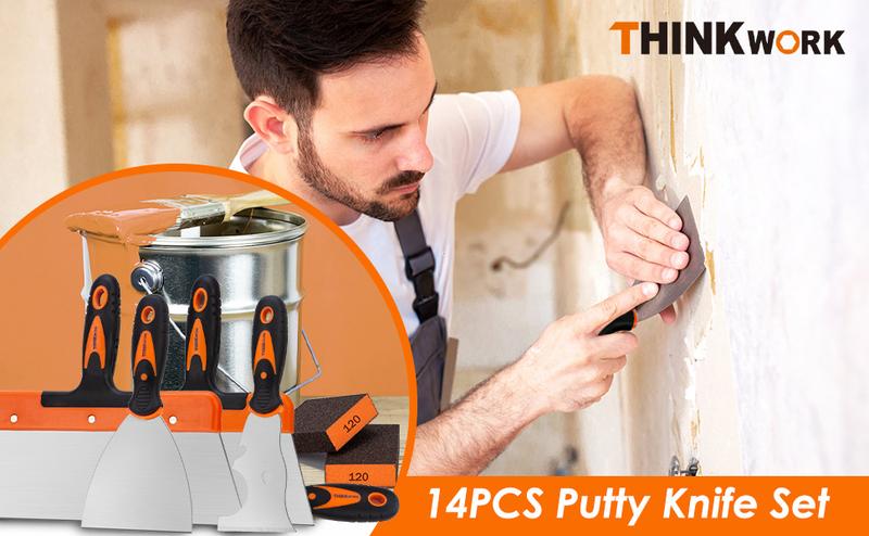 - HIGH QUALITY MATERIAL: THINKWORK putty knife's blade is made of 3CR13 stainless steel, which is strong, flexible and rust-resistant. The surface is mirror polished and easy to clean. The bristles of the paint brush are thick and soft, not easy to fall off. (Tip: 10“, 12” and 14” tape knives have been upgraded to thickened carbon steel material with rust-resistant coating. Please do not damage the coating and store it dry)